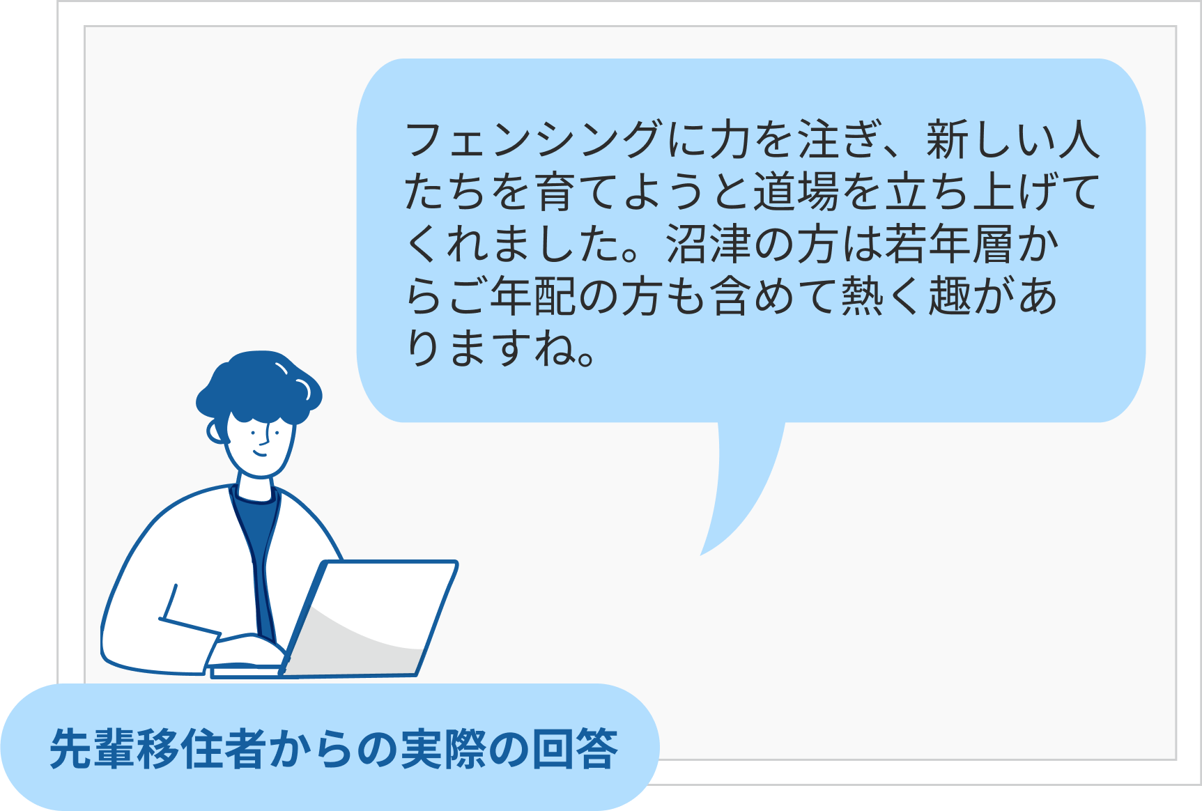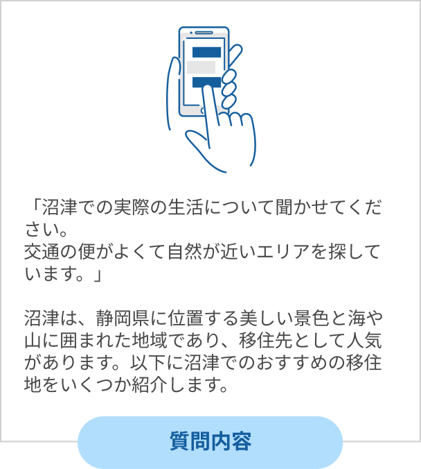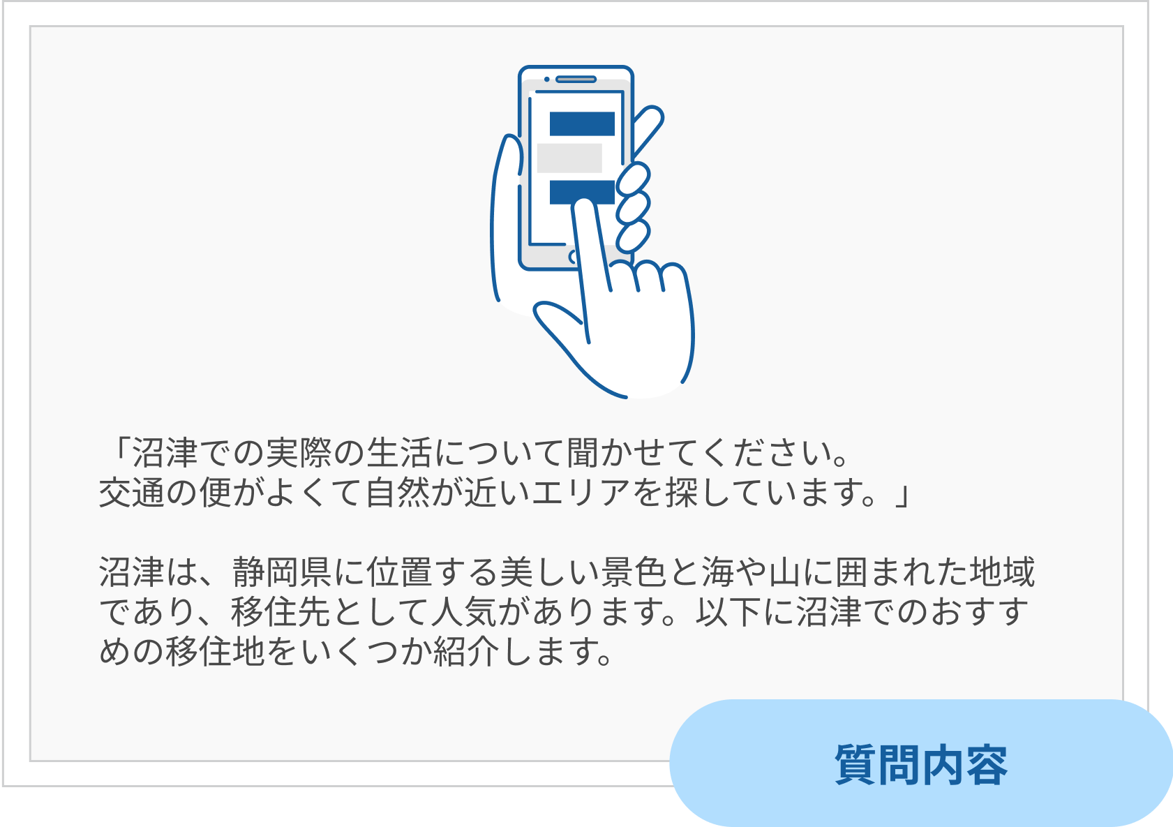 移住でお悩みの人へ、実際にその場所へ移住を経験したさまざまな先輩移住者の⽅や、沼津にくわしい方の体験談をベースにあなたにあった情報提供やアドバイスをするサービスです。